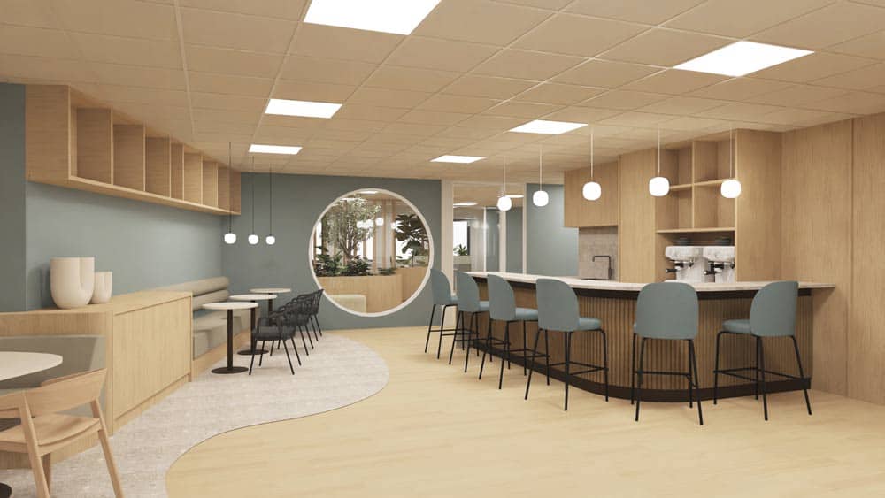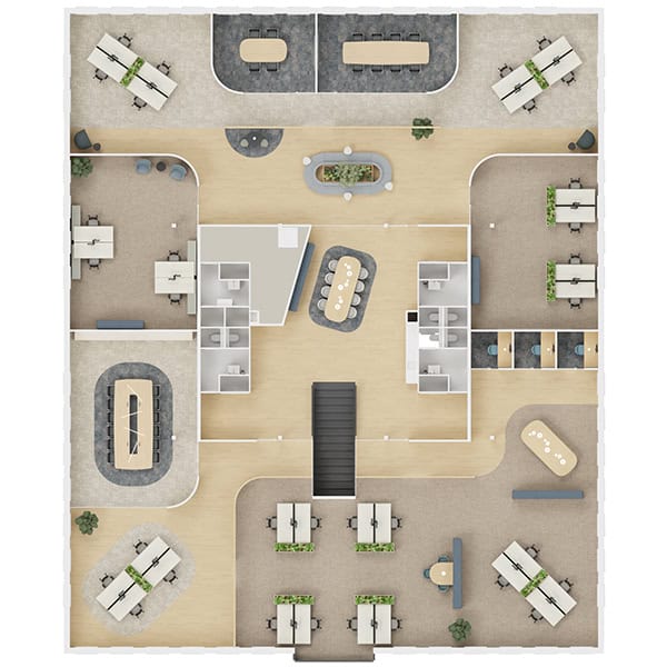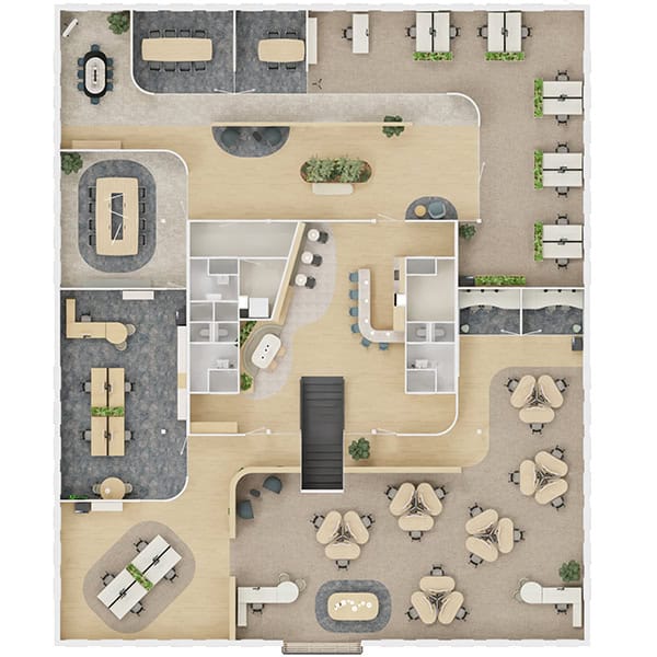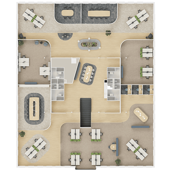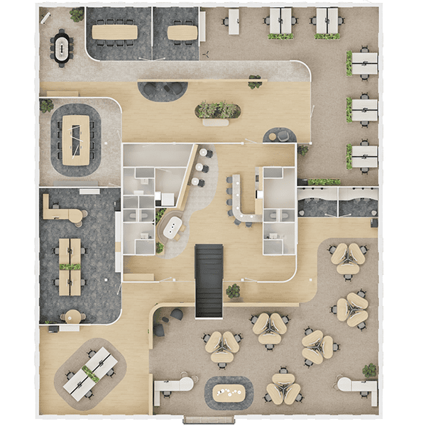 Als de Fit-out en Ambities zijn afgestemd, volgt het definitieve ontwerp en komen kleuren en materialen samen. Dit is voor u de gebruiker het leukste moment. Onze fotorealistische renderingen brengen alles tot leven en u ziet elk besproken detail terug in de presentatie. Uw bezoek aan onze designstudio geeft inzicht in de vloerafwerkingen per ruimte, plafondafwerking, wandkleuren, wand & deuren systemen en alle andere details. U kunt uw bezoek combineren met de showroom van OOFF B.V., onze vaste partner voor systeemmeubilair. Hiermee komt het ontwerp helemaal tot leven, en weet u exact waar u opdracht toe geeft.